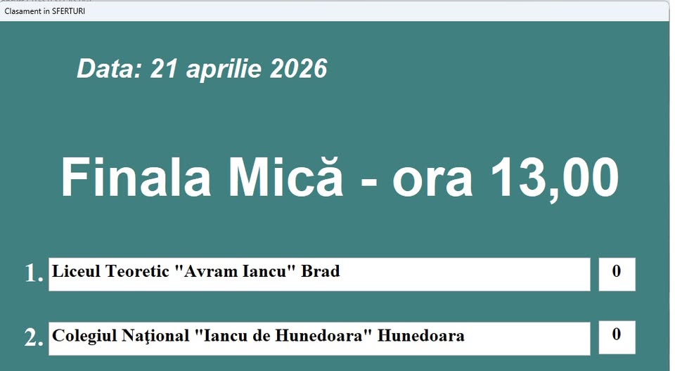 Mâine, 21 aprilie, de la ora 13:00, va avea loc Finala Mică a concursului, în incinta Salle d’Or, la Deva Mall, unde se vor întâlni, în lupta pentru locul al treilea, echipele Colegiului Național „Iancu de Hunedoara” Hunedoara și Liceului Teoretic „Avram Iancu” Brad.