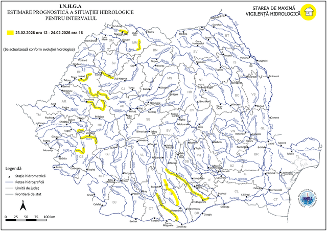 Atenţionarea Cod galben este valabilă pentru anumite sectoare de râuri din judeţele Satu Mare, Maramureş, Cluj, Bihor, Hunedoara, Arad, Alba, Caraş-Severin, Timiş, Olt, Teleorman, Argeş, Dâmboviţa, Giurgiu şi Ilfov.