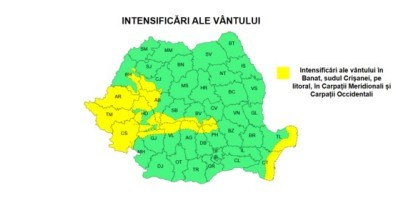 Administraţia Naţională de Meteorologie (ANM) a emis o atenţionare Cod galben privind intensificări ale vântului, valabilă de marţi, de la ora 3.00, până miercuri, la ora 8.00, în judeţele Arad, Timiş, Caraş-Severin şi în unele zone din Bihor, Cluj, Alba, Hunedoara, Gorj, Vâlcea, Argeş, Dâmboviţa, Prahova, Braşov şi Sibiu, precum şi în zona de litoral a judeţelor Tulcea şi Constanţa.