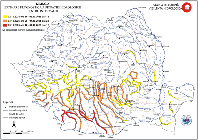 Institutul Naţional de Hidrologie şi Gospodărire a Apelor (INHGA) a anunţat, joi, că, având în vedere situaţia hidrometeorologică actuală şi prognoza meteorologică pentru următoarele 72 de ore, specialiştii au emis o avertizare Cod roşu care intră în vigoare vineri, la ora 12:00, până sâmbătă, la aceeaşi oră.