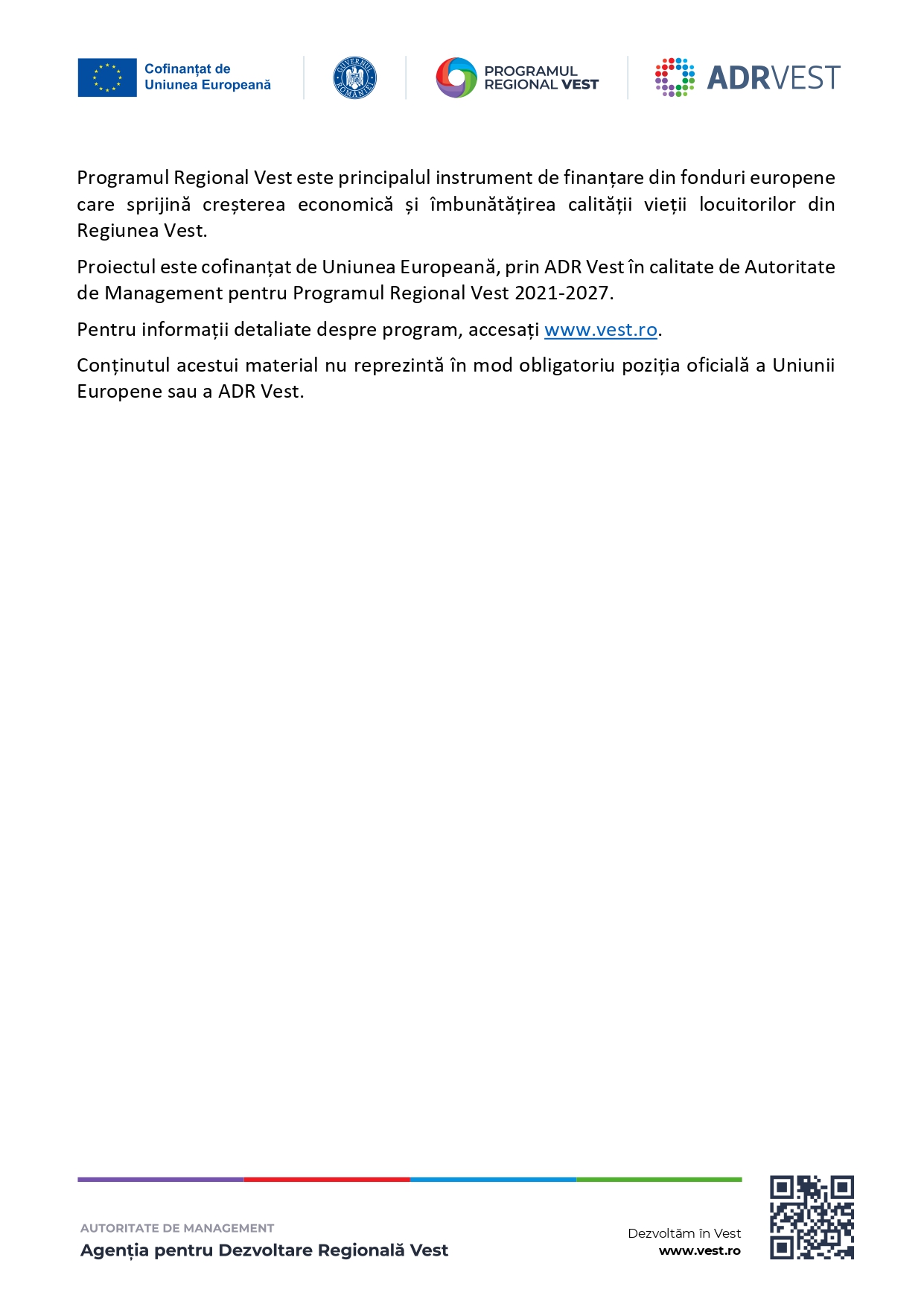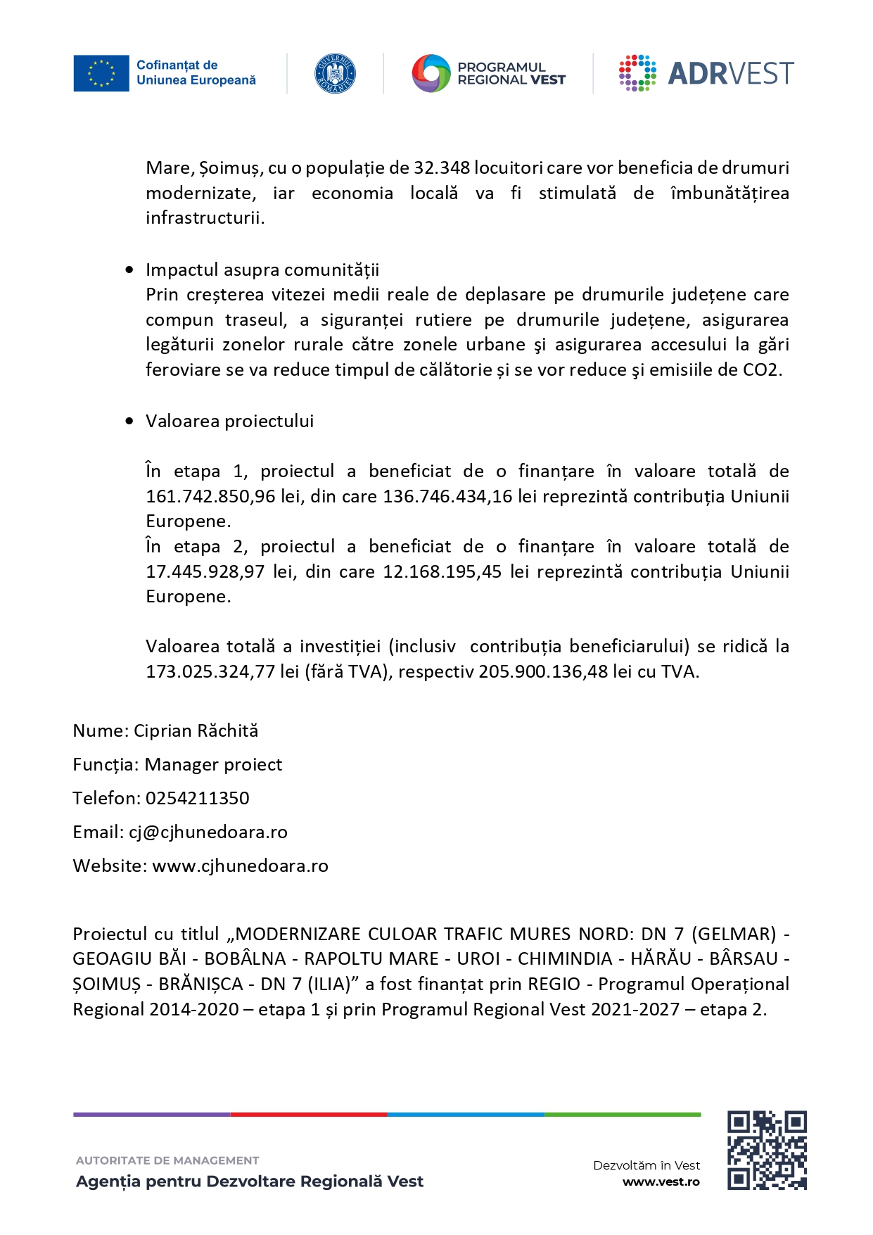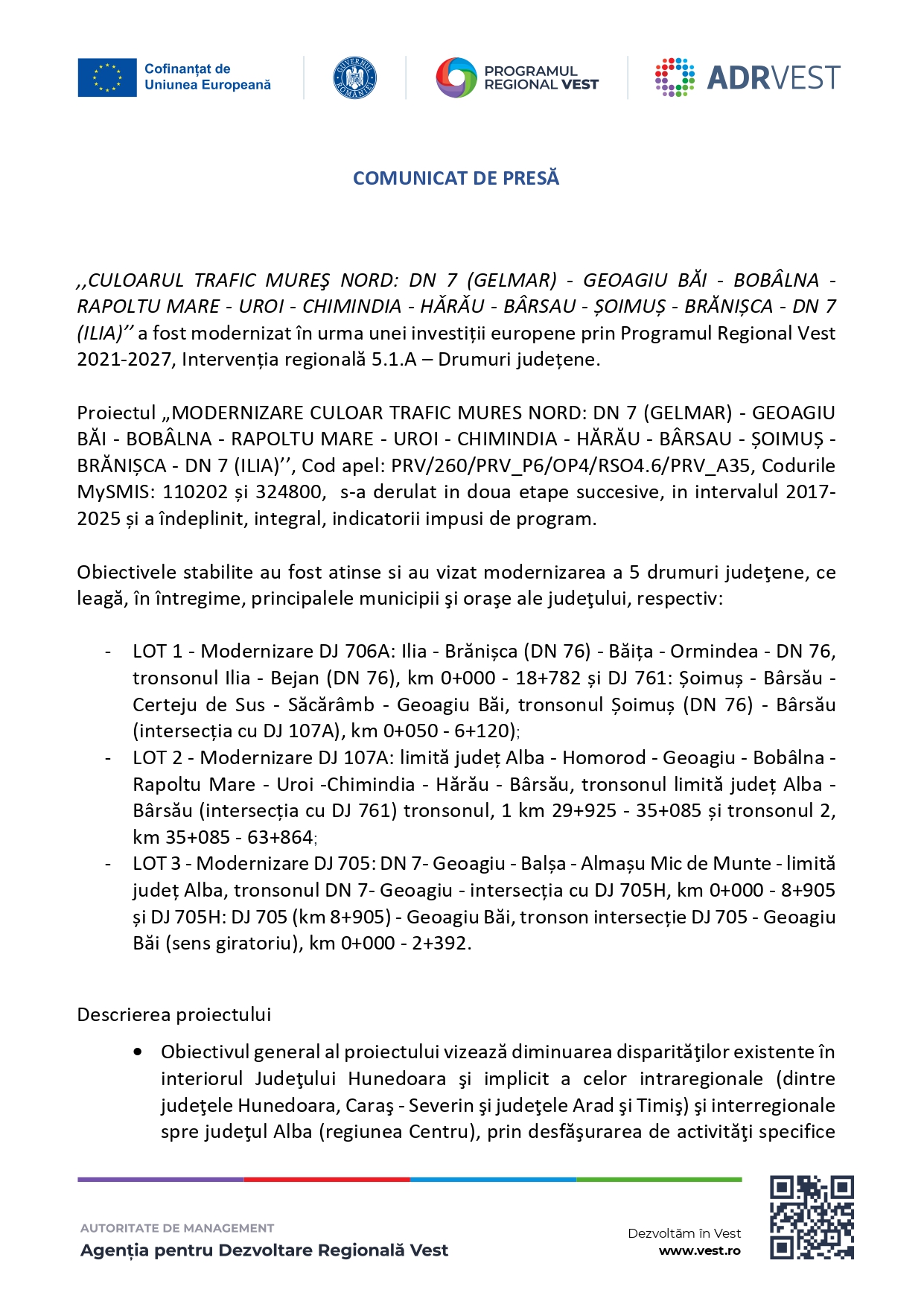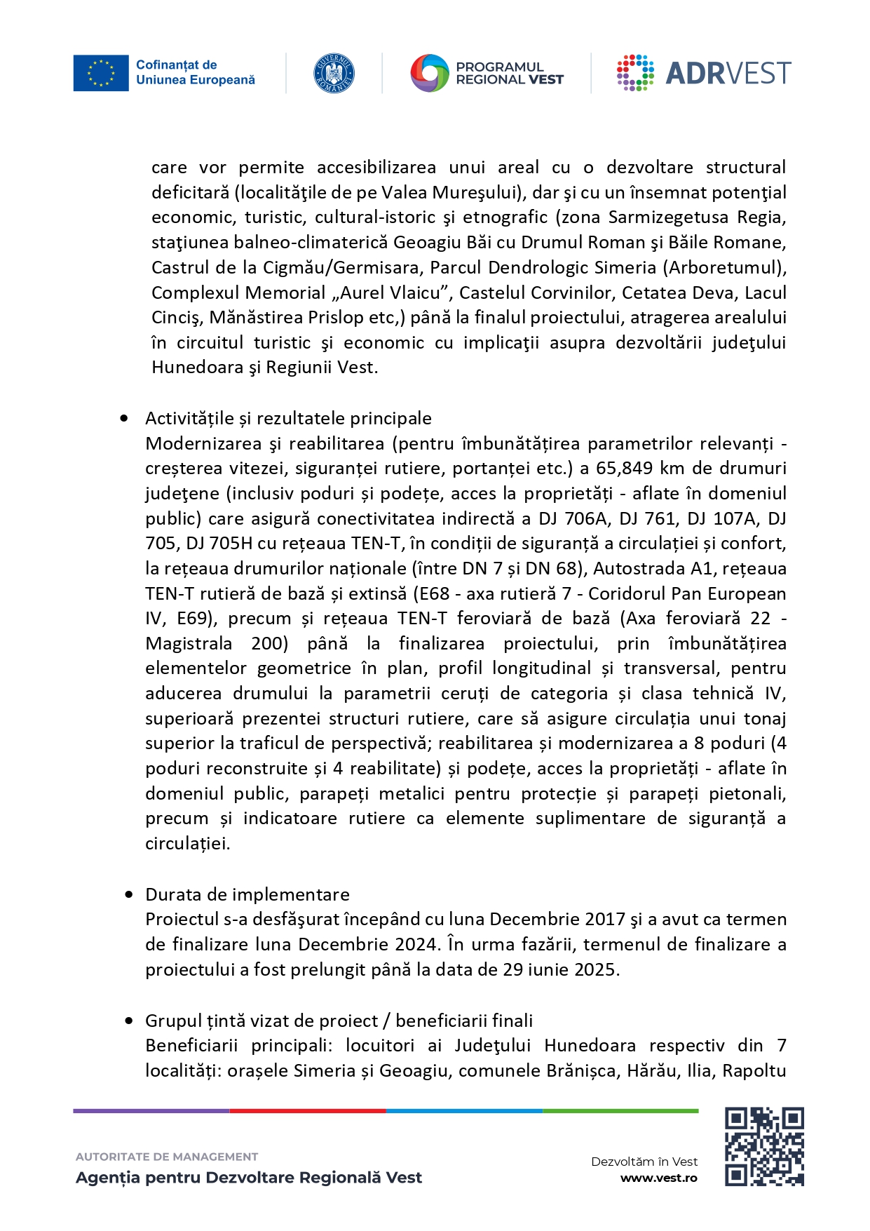 Proiectul, finanțat prin Programul Regional Vest, a vizat modernizarea a peste 65 km de drumuri județene, în beneficiul a zeci de mii de locuitori și al dezvoltării economice și turistice a regiunii.